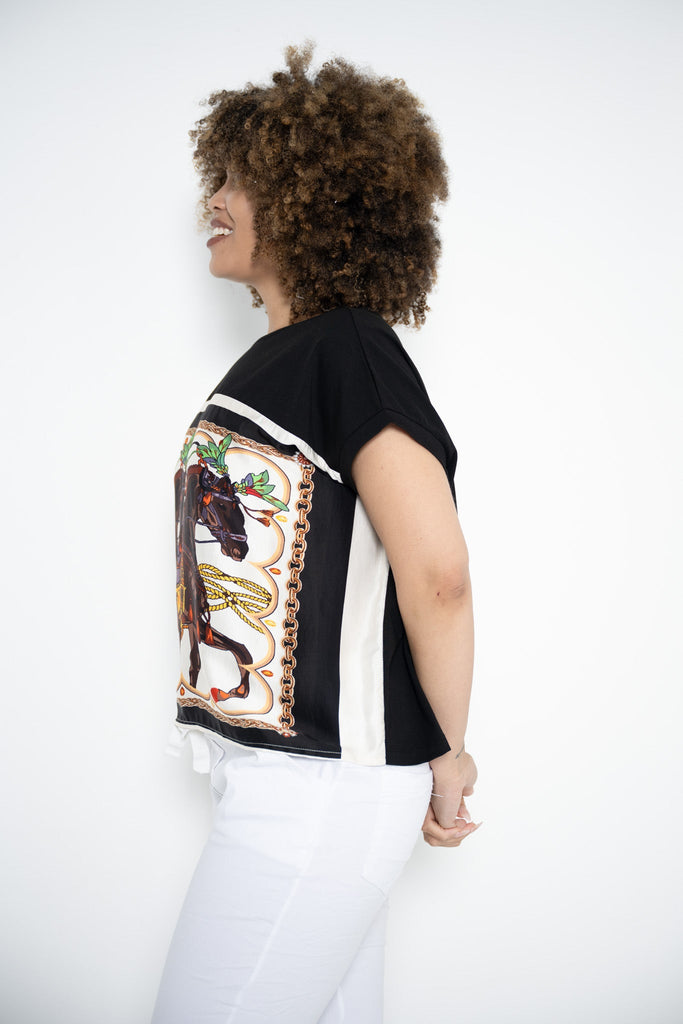 The Animal Tee with Parade Horses captures the drama and elegance of a traditional festival moment. This version pairs a black cotton-blend body with a contrasting white silk front panel, printed with a striking illustration of two horses in full parade dress—adorned with feathers, tassels, and ornate harnesses.