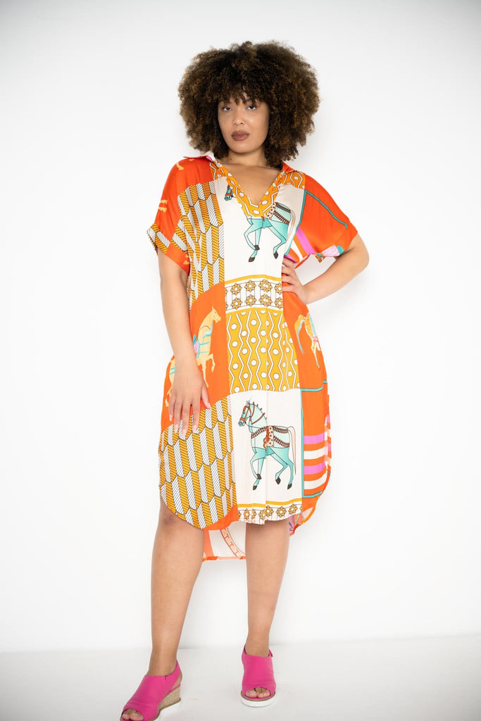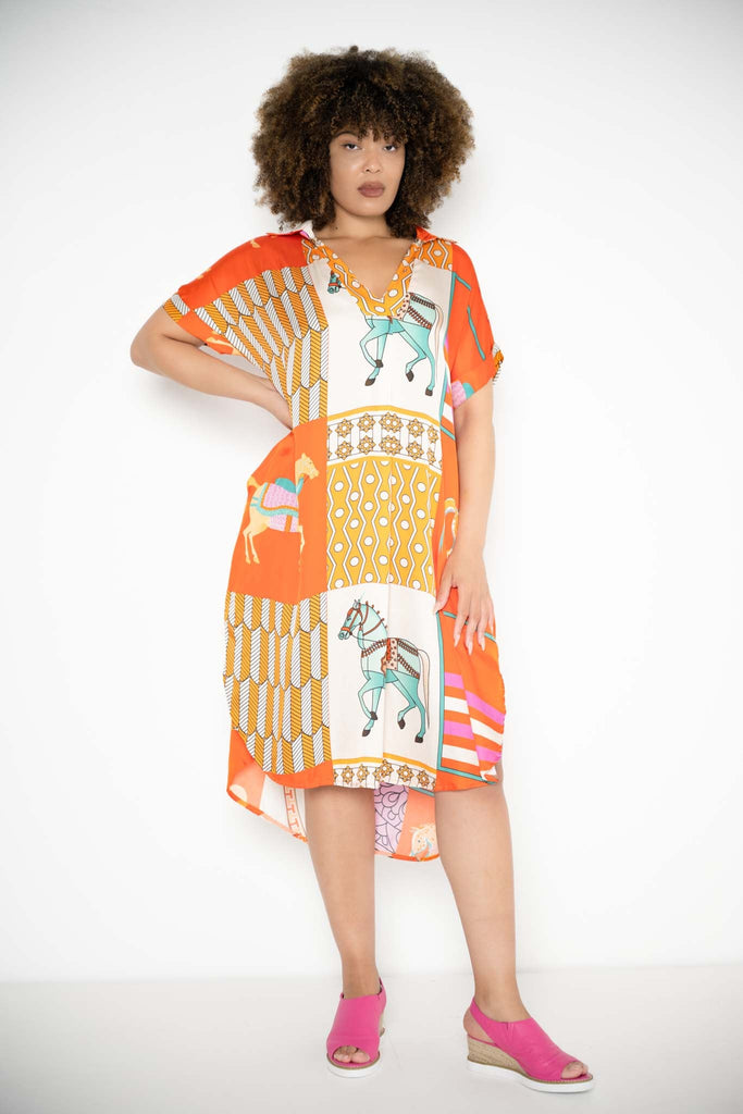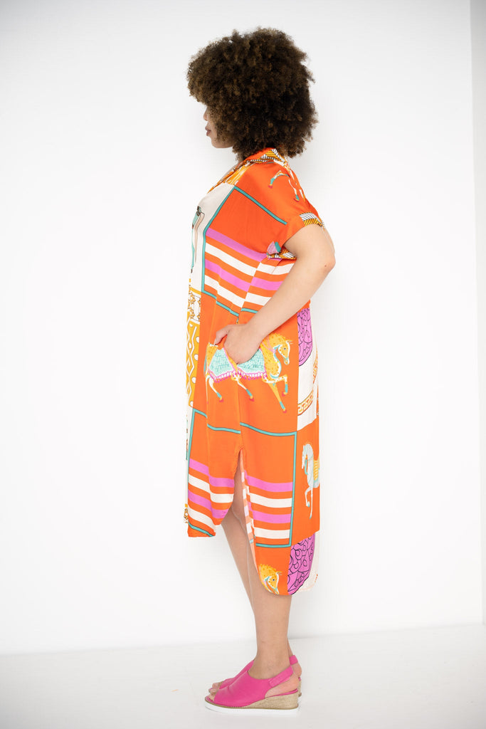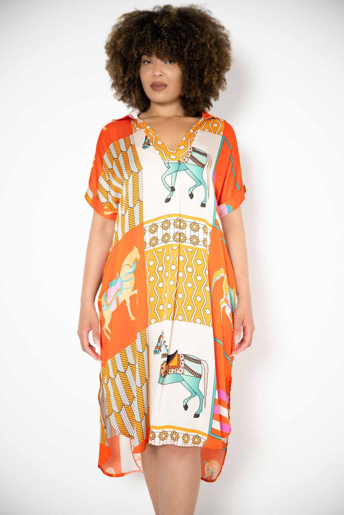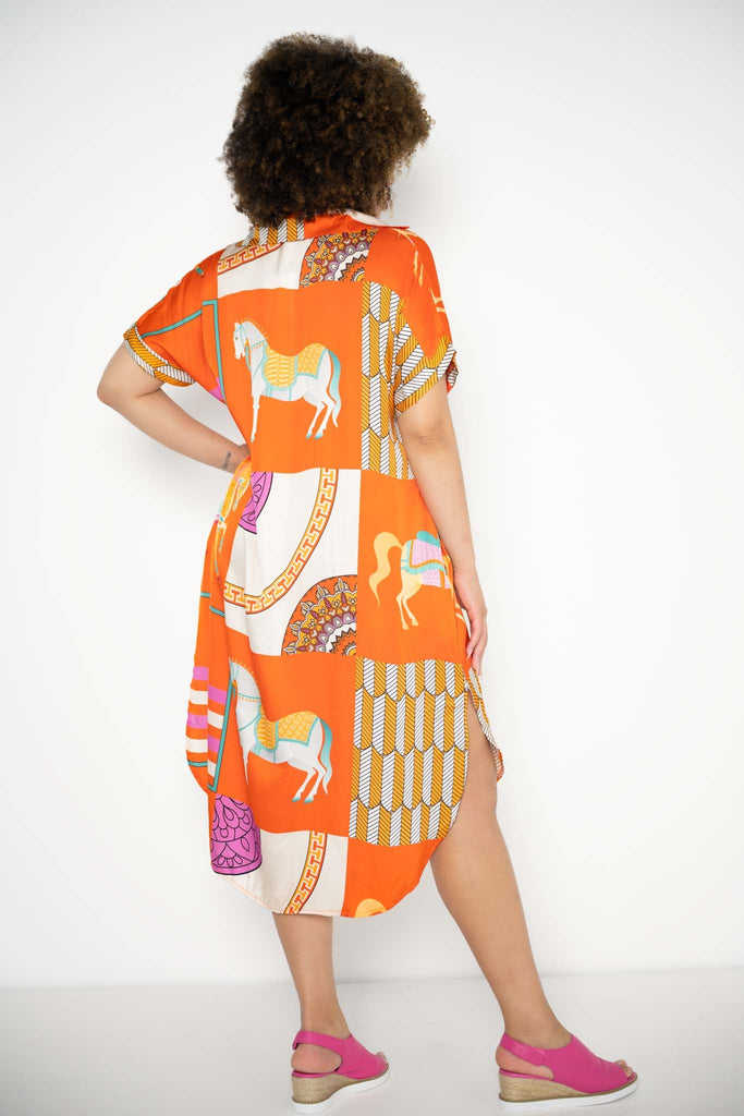 Set against a rich orange backdrop, the print showcases abstract forms and whimsical horses in elaborate parade dress—adorned with tassels, ribbons, and playful details—brought to life in vivid tones of teal and layered oranges. The mid-calf length is finished with a curved hem front and back, adding fluidity to the wide, generous cut.